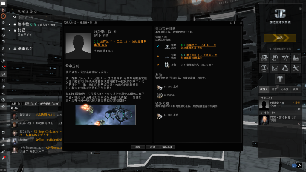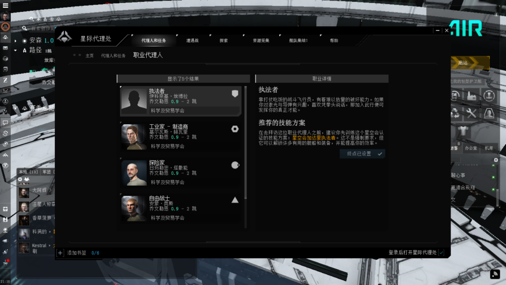 与欧服一样,教程任务之后就有职业代理人任务。这些新手任务可以取得几艘护卫舰与挖矿用的冲锋者级号。一番游戏设置调整为可以接受的窗口之后,使用代理人搜索照到了新手职业代理人任务,然后出发。