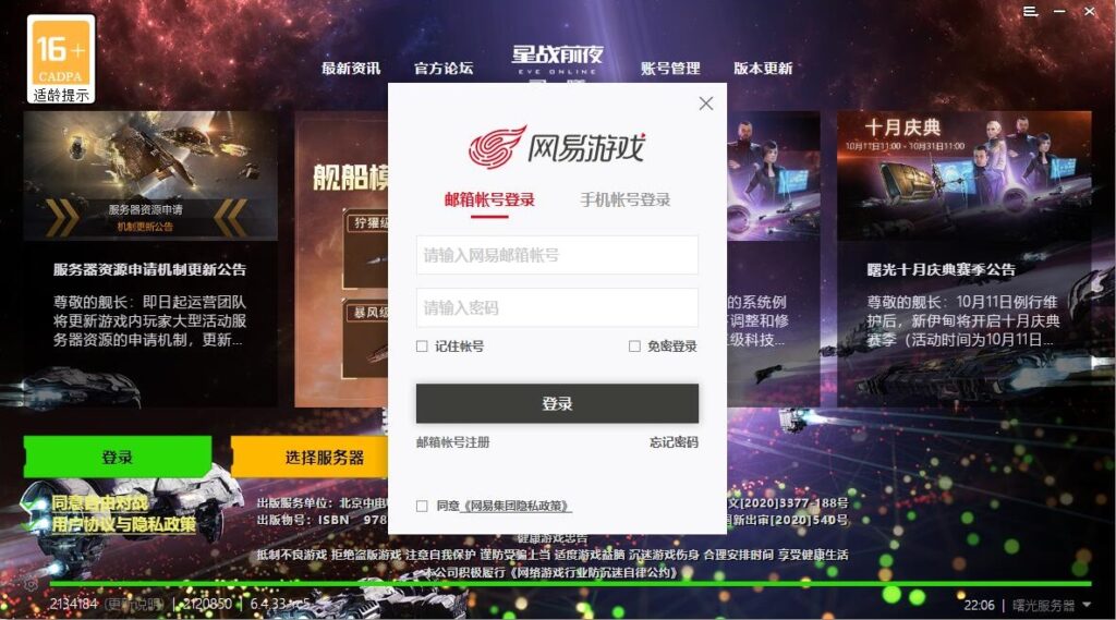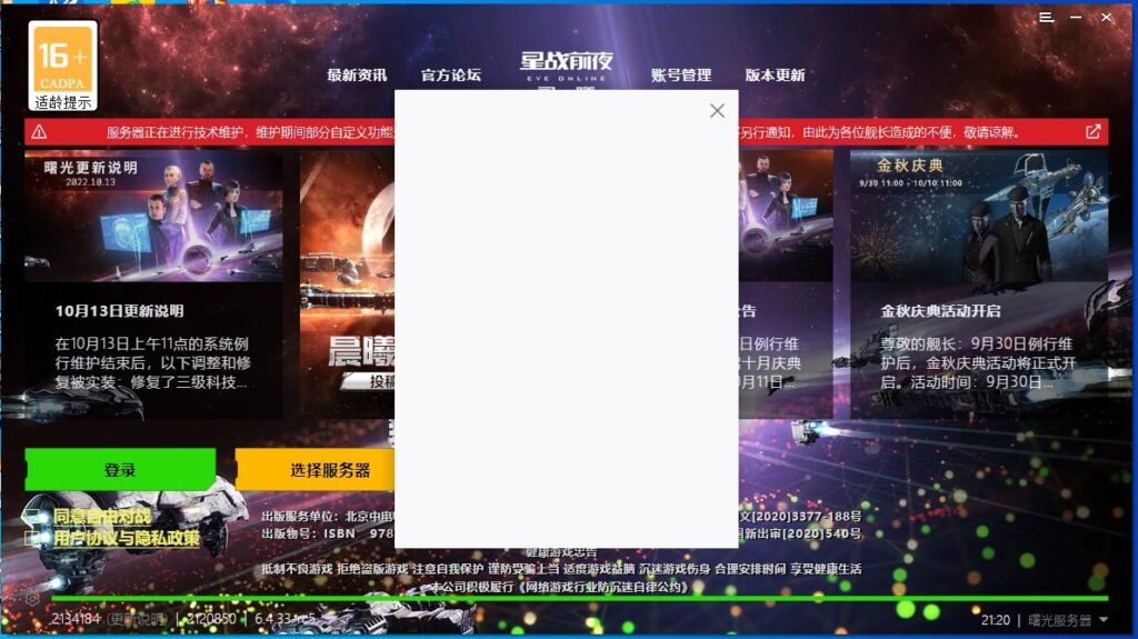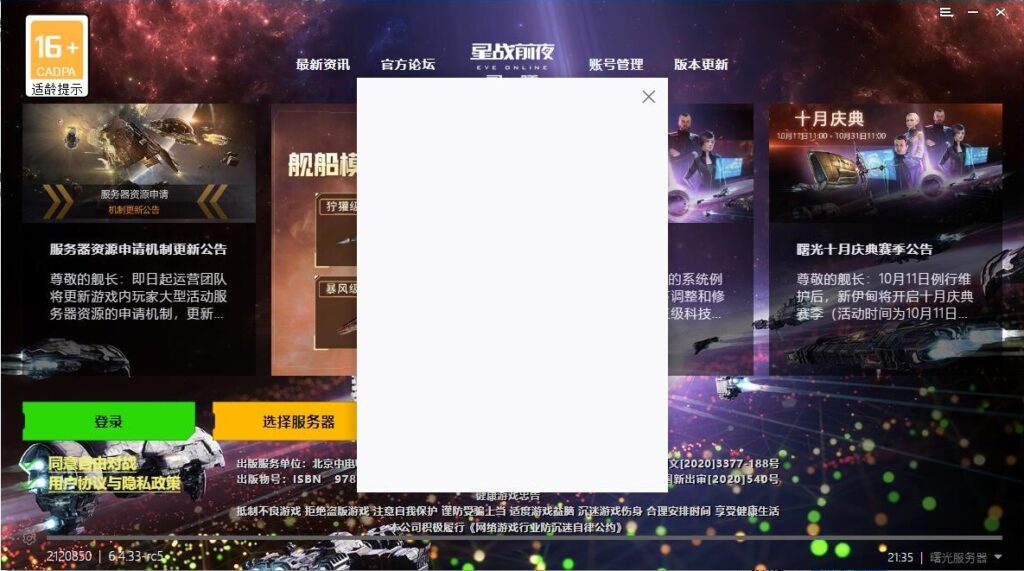 之前说到因我无法直接浏览中国EVE官网,EVE中国客户端安装器还是远程进入远在中国的老廖家的主机下载到群晖网盘,我再从老廖的群晖下载到马来西亚安装在电脑,安装之后游戏更新速度不错,推测是有置放在海外的更新服务器镜像供应。只是更新完成之后开启客户端。。。